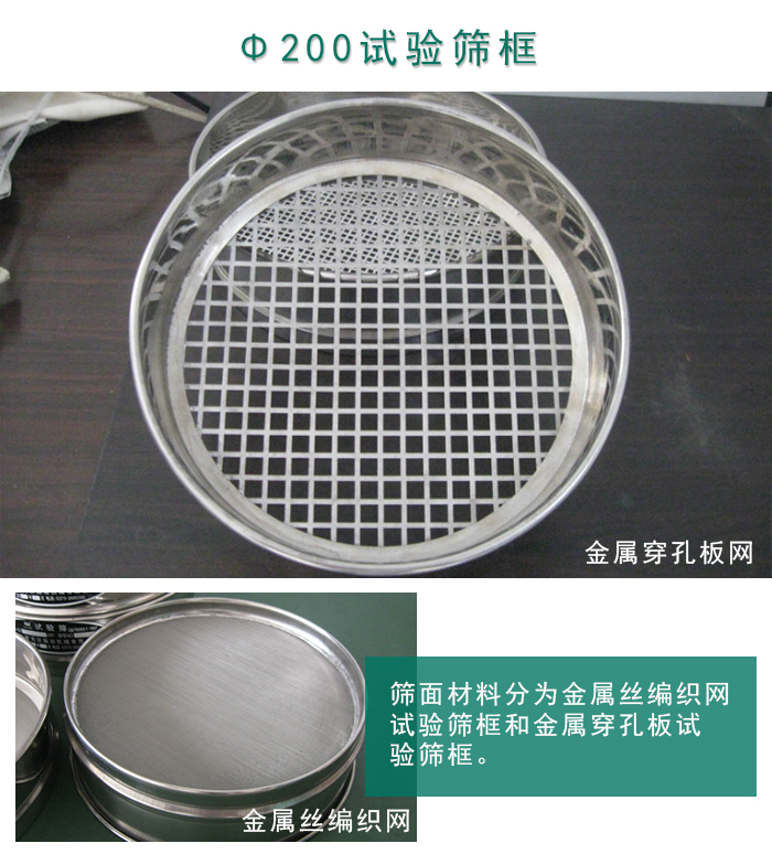 Φ200試驗(yàn)篩框根據(jù)篩面材料分為金屬絲編織網(wǎng)試驗(yàn)篩框和金屬穿孔板試驗(yàn)篩框。金屬絲編織網(wǎng)試驗(yàn)篩框采用標(biāo)準(zhǔn)GB/T6003.1-1997生產(chǎn)。其網(wǎng)孔基本尺寸為2.36mm-0.038mm,符合行業(yè)標(biāo)準(zhǔn)3310-1:1990 R20/3,R20,R40/3系列,篩網(wǎng)材質(zhì)為316L材質(zhì)、304不銹鋼材質(zhì)制作。金屬穿孔板試驗(yàn)篩采用國家標(biāo)準(zhǔn)GB/T6003.2-1997,符合行業(yè)標(biāo)準(zhǔn)3310-2:1990 R20/3、R20、R40/3系列,篩網(wǎng)材質(zhì)為紫銅,并采用電化學(xué)加工而成。
