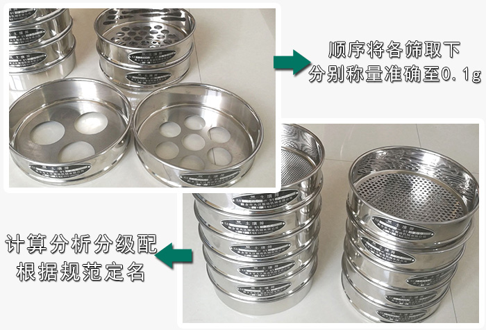 3.由較大孔徑篩開始,順序?qū)⒏骱Y取下,將留在各篩上的土分別稱量,準(zhǔn)確至0.1g。各篩上土質(zhì)量之和與總土質(zhì)量之差不得大于總土質(zhì)量的l%;